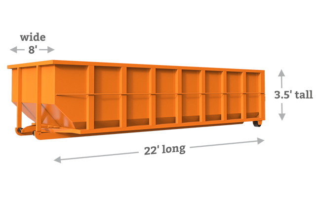 Typical 20 yard roll off containers have dimensions of length: 22 feet, width: 8 feet, height: 3.5 feet.